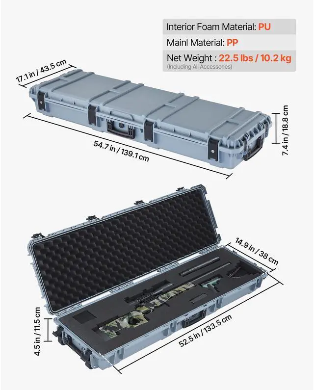 Mainl Material: PP,Net Weight (Including All Accessories): 22.5 lbs / 10.2 kg,Latches: 8 (2 Lockable),Waterproof Rating: IP67,Foam Type: Egg-Crate, Tearable Mesh Layers, Solid Layer,Color: Grey,Handles: 3,Upper Internal Dimensions: 52.5 x 14.9 x 1.5 in / 133.5 x 38 x 4 cm,Lock Points: 4,Item Model Number: 1333816,Pressure Release Valve: Yes,Product Dimensions (L x W x H): 54.7 x 17.1 x 7.4 in / 139.1 x 43.5 x 18.8 cm,Lower Internal Dimensions: 52.5 x 14.9 x 4.5 in / 133.5 x 38 x 11.5 cm,Interior Foam Material: PU