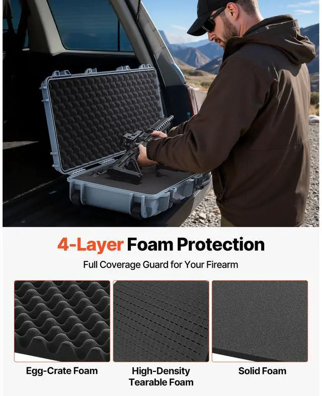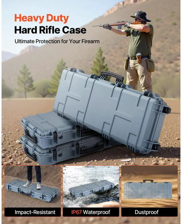 VEVOR Hard Rifle Case, Lockable Rifle Case with Pre-cut Foams, 42 in Movable Gun Storage with Wheels, IP67 Waterproof & Dustproof Pistol Storage for Rifle, Shotgun, Airsoft Gun, Grey