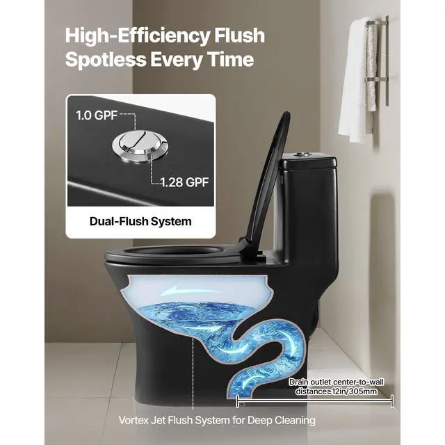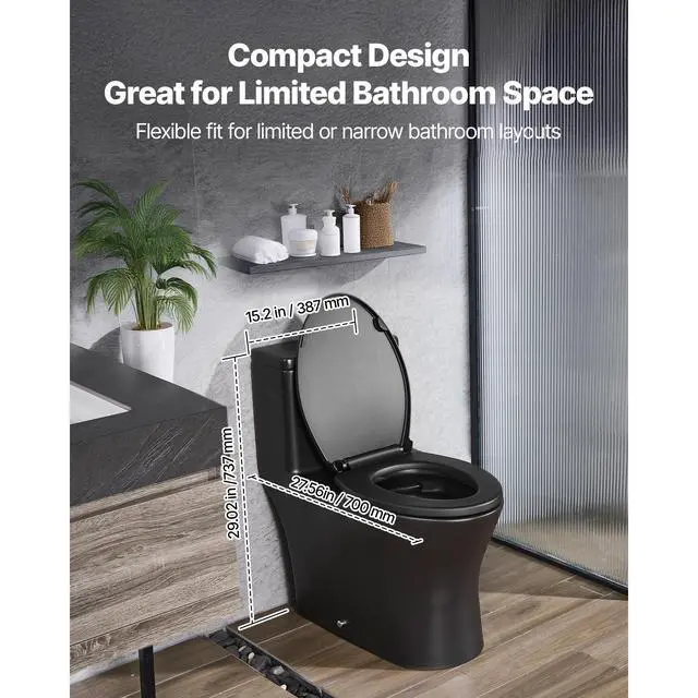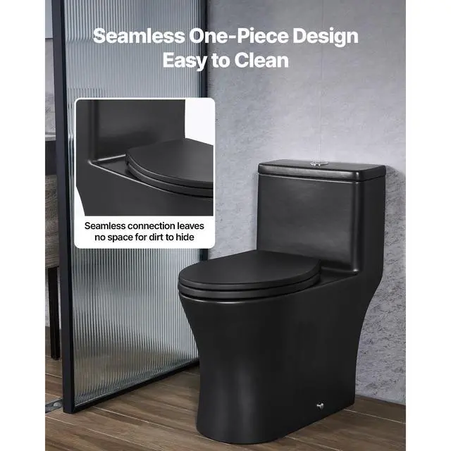 VEVOR One-Piece Toilet, Elongated Toilet Vortex Dual-Flush 1.0/1.28 GPF, Toilets for Bathroom with Comfortable Chair Seat, Standard Height, Easy-Clean Skirted Design, 12 inch Rough-In, Black + Silver