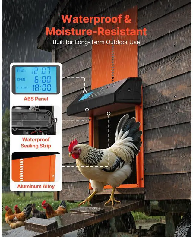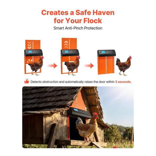 VEVOR Automatic Chicken Coop Door, Battery Powered Chicken Coop Door with Timer & Manual Setting, Anti-Pinch Security, Durable Aluminum Alloy, Chick Run Gate Opener with Waterproof Sealing, Orange