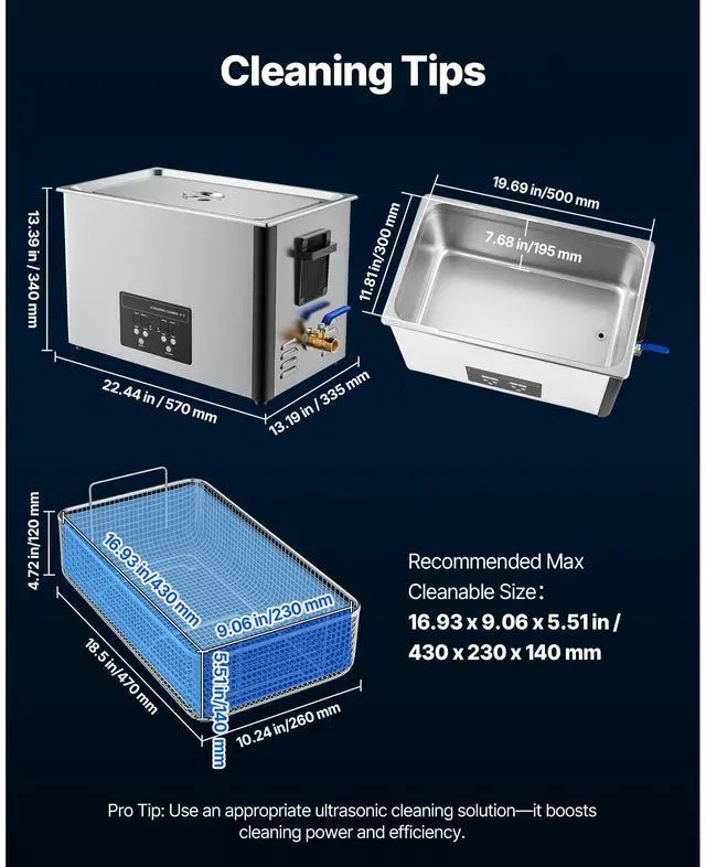 Noise Level: 75dB,Timer: 030 min,Capacity: 30L,Item Model Number: TH-100ATP,Product Weight: 26.01 lbs/11.8 kg,Frequency: 40kHz,Temperature Range: 32176°F/080°C,Ultrasonic Power: 480W,Product Dimensions: 22.44 x 13.19 x 13.39 in/570 x 335 x 340 mm,Heating Power: 600W