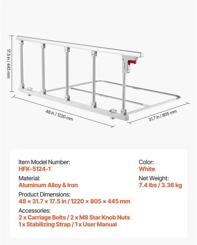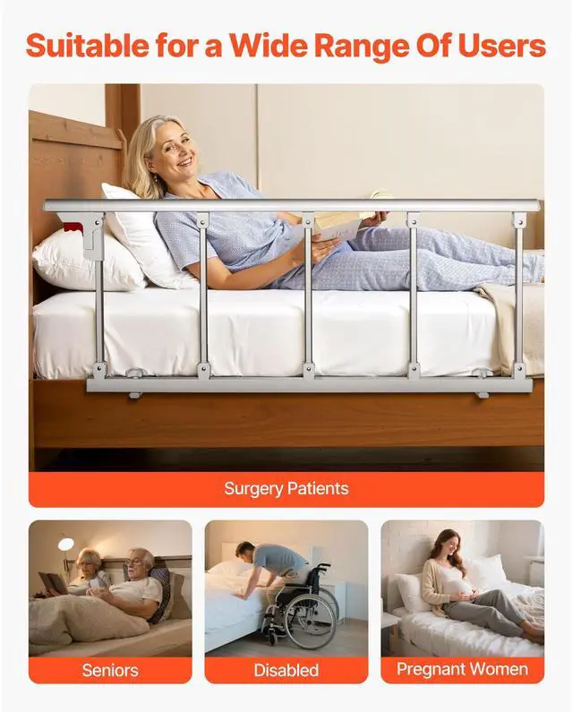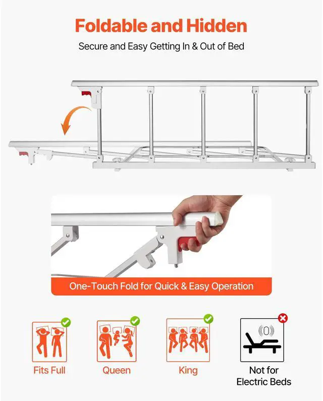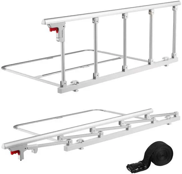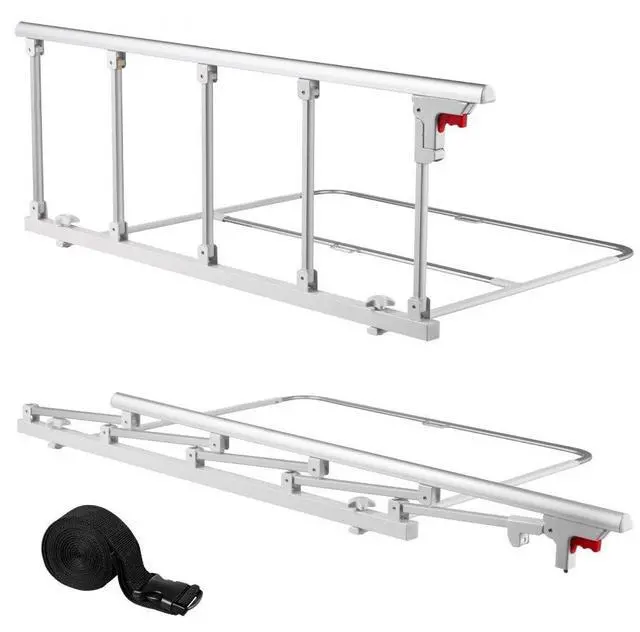 VEVOR Foldable Bed Rail for Elderly, 48 in Bedside Assist Rail with Fixing Strap, Adjustable Height Pipe Bedside Cane, High-Strength Metal Senior Bed Bar, Hand Guard Grab Fits King, Queen, Full, Twin