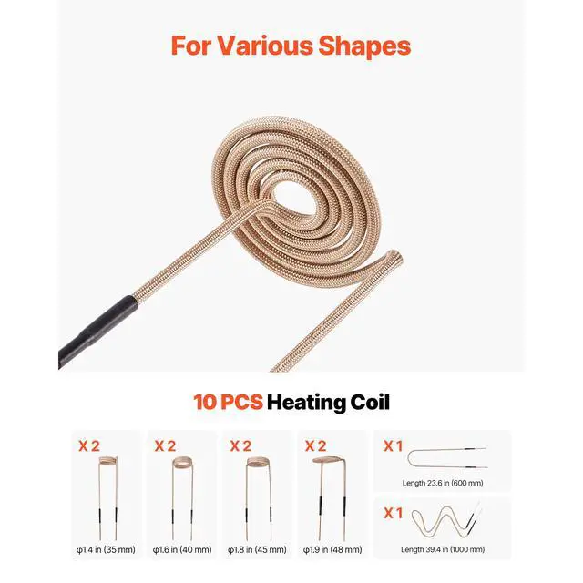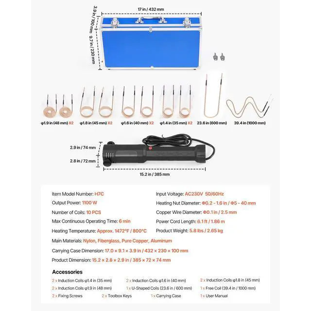 Copper Wire Diameter: 0.1 in / 2.5 mm,Power Cord Length: 6 ft / 1.9 m,Main Materials: Nylon, Fiberglass, Pure Copper, Aluminum,Output Power: 1100W,Product Dimension: 15.2 x 2.8 x 2.9 in / 385 x 72 x 74 mm,Item Model Number: H7C,Product Weight: 5.8 lbs / 2.62 kg,Max Continuous Operating Time: 6 min,Heating Temperature: Approx. 1472 / 800,Carrying Case Dimension: 17.0 x 9.1 x 3.9 in / 432 x 230 x 100 mm,Heating Nut Diameter: 0.2-1.6 in / 5-40 mm,Number of Coils: 10