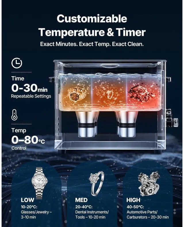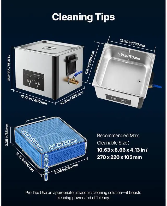 Noise Level: 75dB,Timer: 030 min,Capacity: 15L,Item Model Number: TH-60ATP,Product Weight: 15.08 lbs/6.84 kg,Frequency: 40kHz,Temperature Range: 32176°F/080°C,Ultrasonic Power: 240W,Product Dimensions: 15.75 x 12.8 x 11.61 in/400 x 325 x 295 mm,Heating Power: 400W