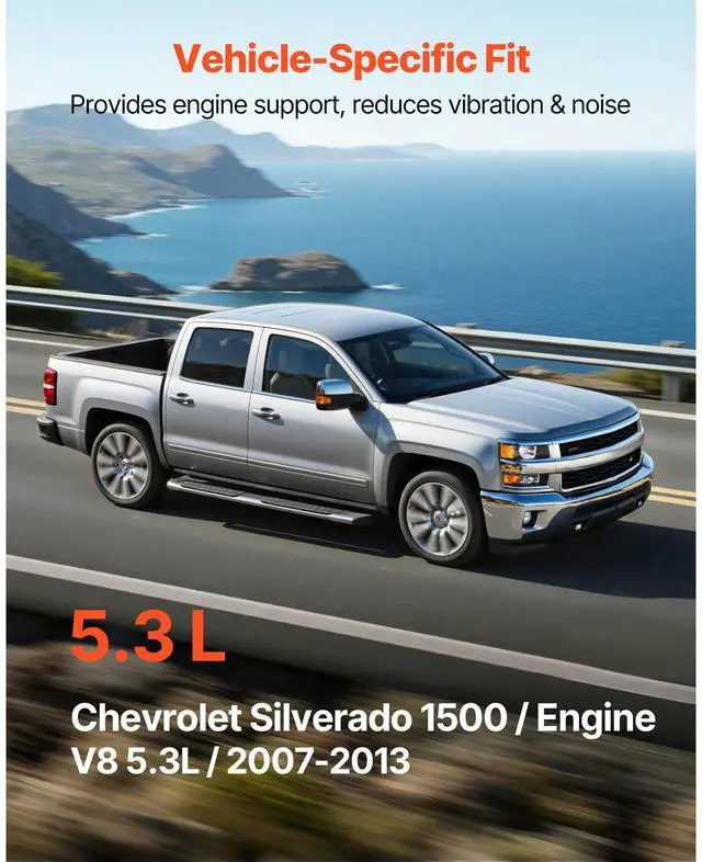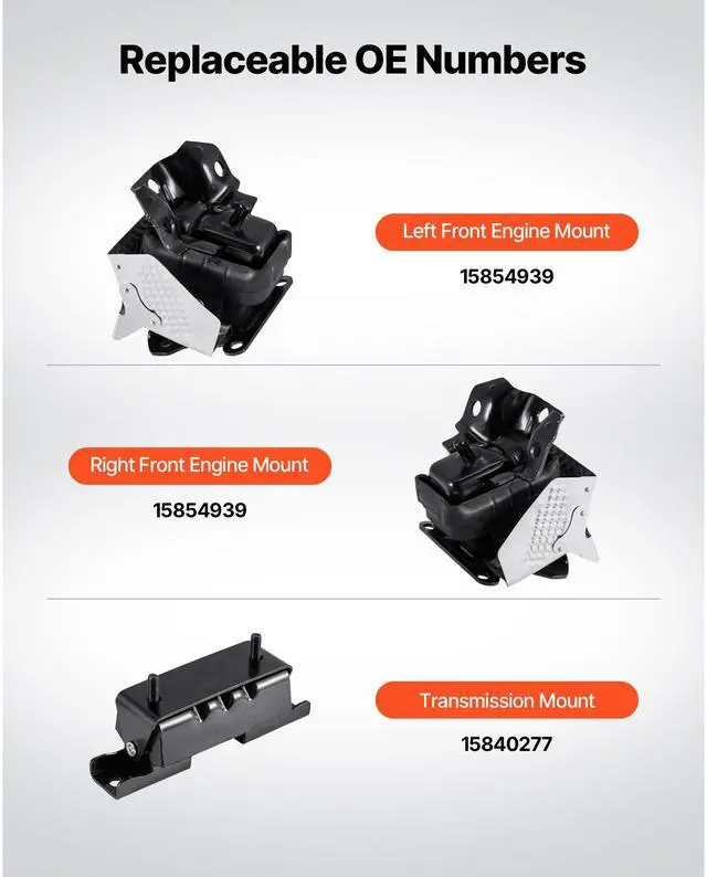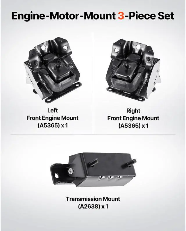 Kit Contents: Left Front, Right Front & Transmission Mounts,OE Number: A5365, A5365, A2638,Item Model Number: TZ0066,Quantity: 3 PCS,Compatible Vehicles: Chevrolet Silverado 1500 V8 5.3L (2007-2013),Material: Iron, Aluminum,Item Dimensions: 8.7 x 4.1 x 3 in / 220 x 105 x 75 mm,Net Weight: 13.4 lbs / 6.1 kg