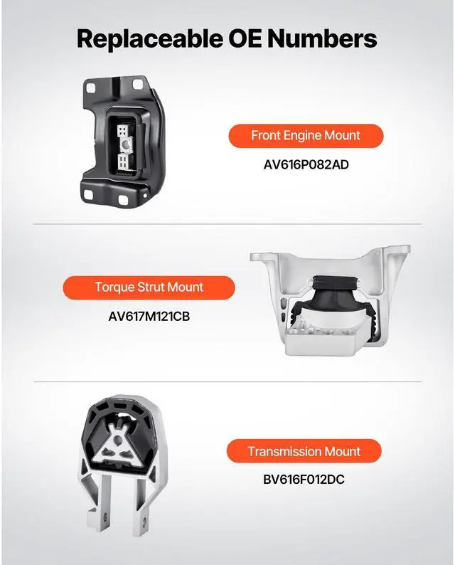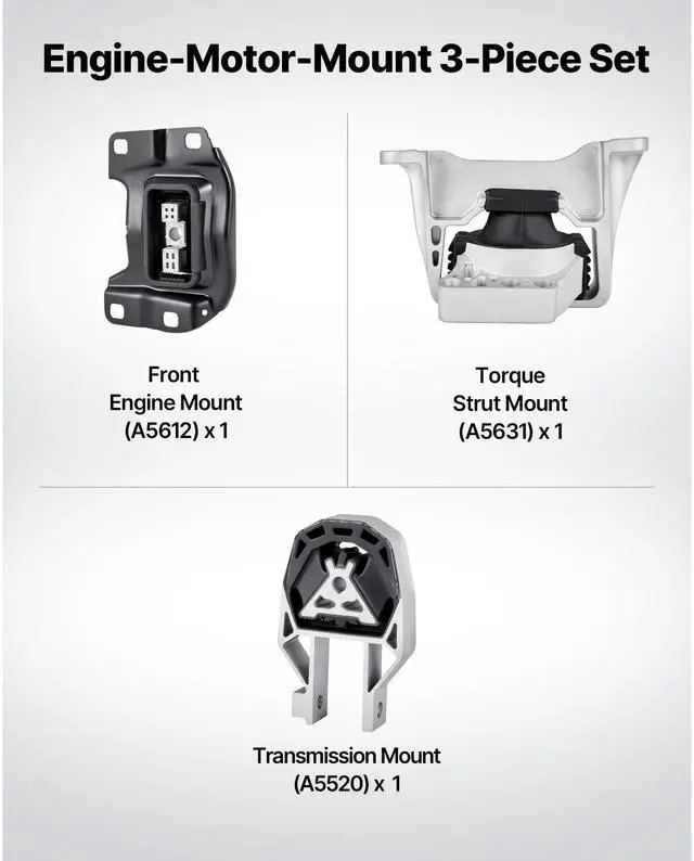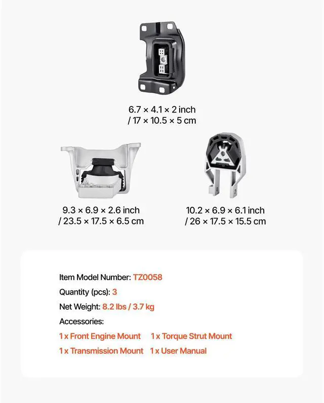 Kit Contents: Front, Torque Strut & Transmission Mounts,OE Number: A5612, A5631, A5520,Item Model Number: TZ0058,Quantity: 3 PCS,Compatible Vehicles: Ford Escape L4 2.0L (2013-2019),Material: Iron, Aluminum,Item Dimensions: 10.2 x 6.9 x 6.1 in / 260 x 175 x 155 mm,Net Weight: 8.2 lbs / 3.7 kg
