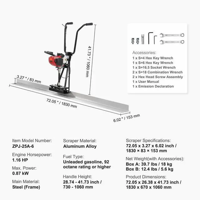 Net Weight(with Accessories): Box A:39.7 lbs / 18 kg; Box B:12.4 lbs / 5.6 kg,Scraper Specifications: 72.05 x 3.27 x 6.02 inch / 1830 x 83 x 153 mm,Adjustable Handle Height: 28.7 - 41.7 inch / 730-1060 mm,Model: ZPJ-25A-6,Scraper Material: Aluminum Alloy,Max. Power: 0.87 kW,Engine Horsepower: 1.16 HP,Product Dimensions: 72.05 x 26.38 x 41.73 inch / 1830 x 670 x 1060 mm,Main Material: Steel,Fuel Type: Unleaded gasoline, 92 octane rating or higher