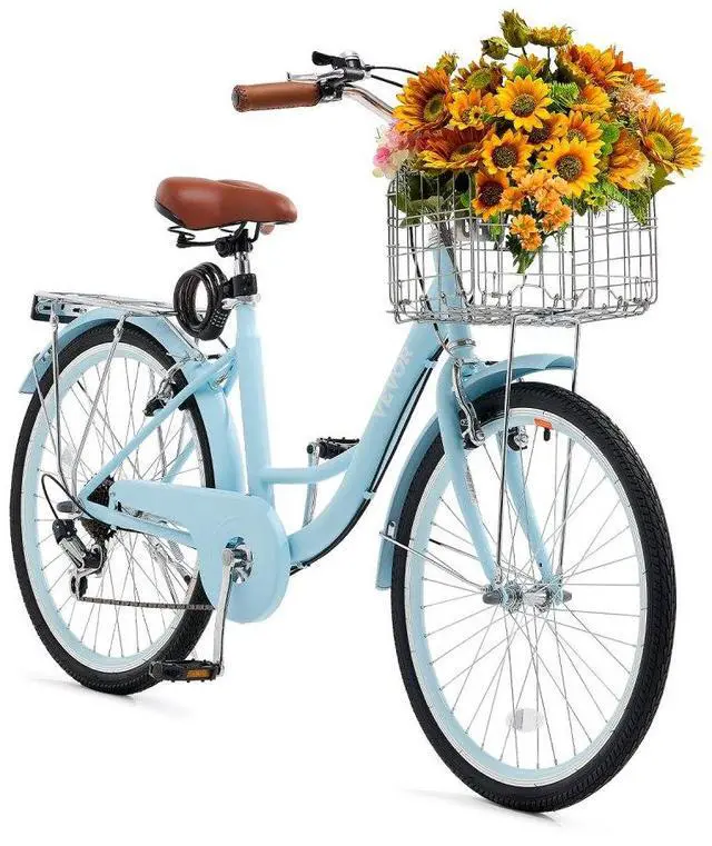 VEVOR Cruiser Bike, 7-Speed, 24-Inch Light Blue Beach Cruiser Bike with Large Capacity Basket and Rear Rack, Secure & Sturdy Cruiser Bike with Adjustable Seat, Fits for Cycling, Exercise & Shopping