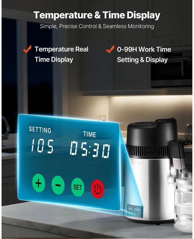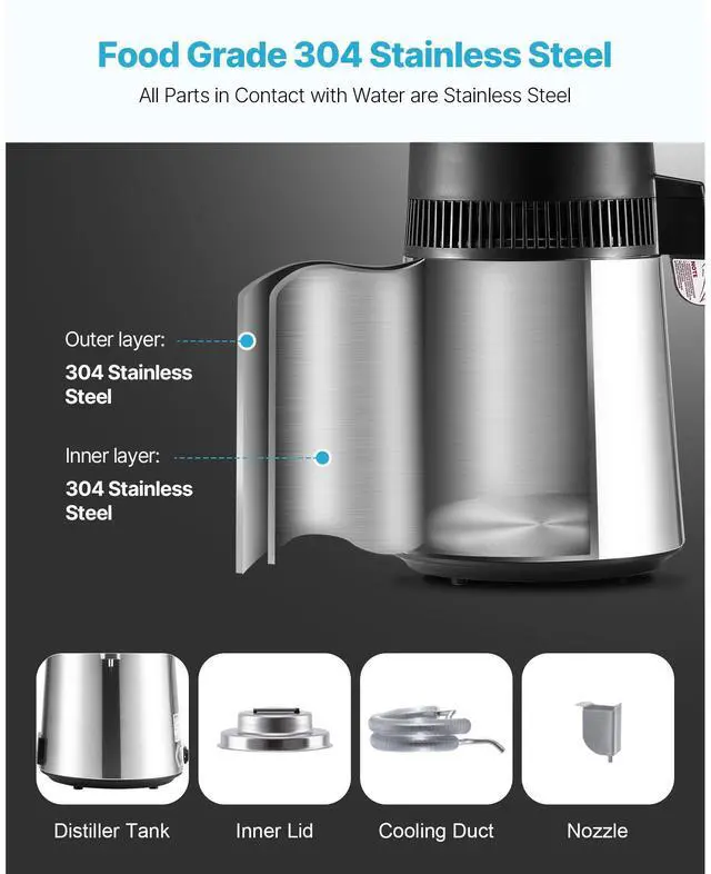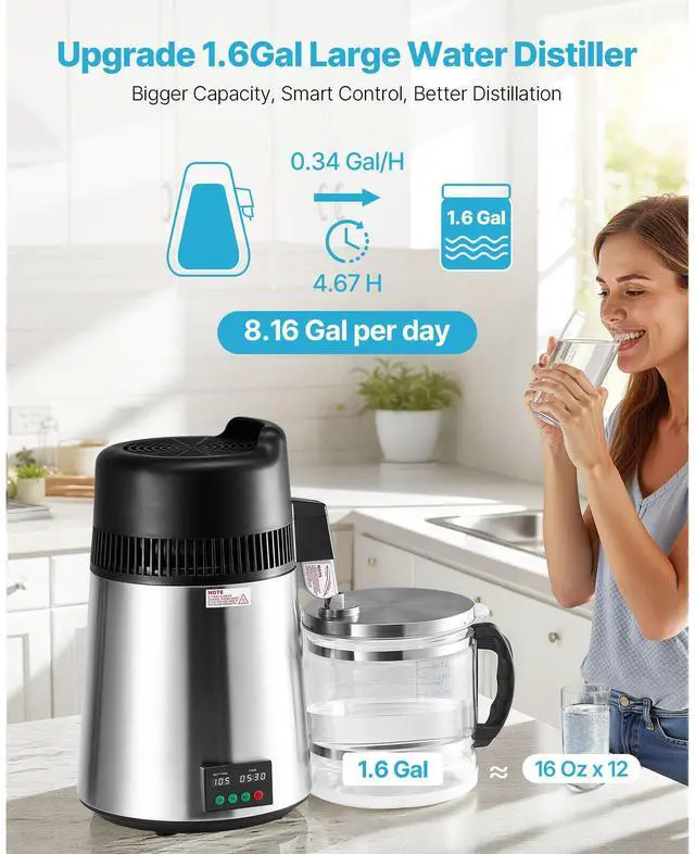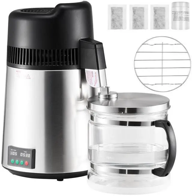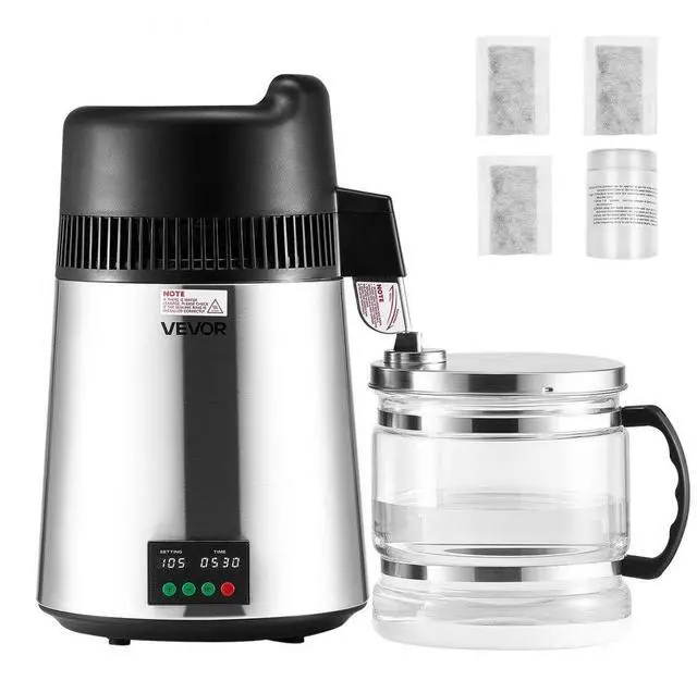 VEVOR Water Distiller, 6L 1.6 Gallon Larger Pure Water Purifier Filter For Home Table Countertop, 900W Glass Pot Distilled Maker, Stainless Steel Interior Drinking Machine to Make Clean Waters, Silver