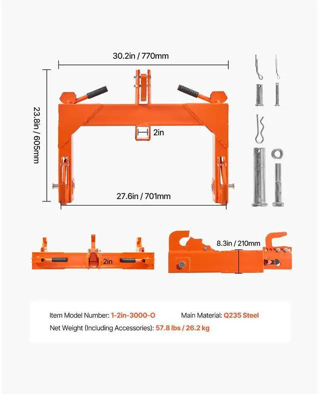 Net Weight (Including Accessories): 57.8 lbs / 26.2 kg,Product Capacity: 3000 lbs,Receiver Width: 2 in,Lower Arm Distance: 27.6 in,Color: Orange,Item Model Number: 1-2in-3000-O,Top Outer Diameter: 30.2 in,Product Dimensions (L x W x H): 30.3 x 8.3 x 23.8 in / 770 x 210 x 605 mm,Main Material: Q235 Steel