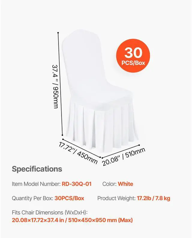Fits Chair Dimensions (WxDxH): 20.08×17.72×37.4 in / 510x450x950 mm (Max),Color: White,Item Model Number: RD-30Q-01,Quantity Per Box: 30PCS/Box,Net Weight: 17.2lb / 7.8 kg