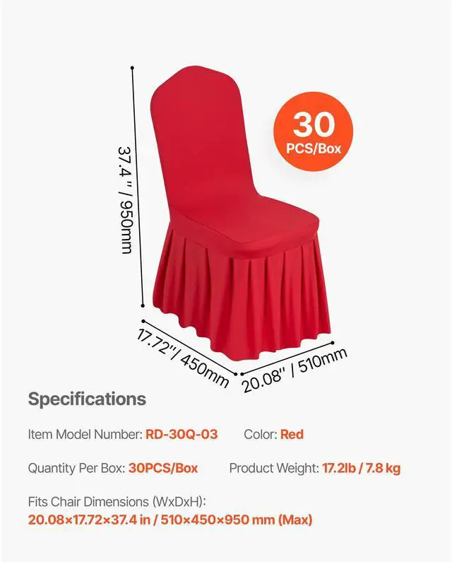 Fits Chair Dimensions (WxDxH): 20.08×17.72×37.4 in / 510x450x950 mm (Max),Color: Red,Item Model Number: RD-30Q-03,Quantity Per Box: 30PCS/Box,Net Weight: 17.2lb / 7.8 kg