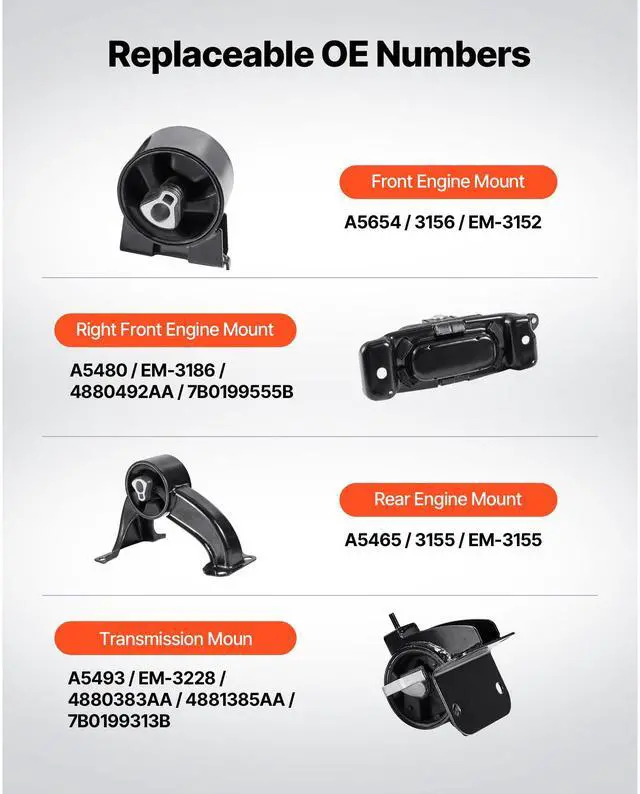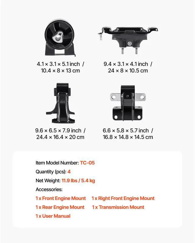 Kit Contents: Front, Right Front, Rear & Transmission Mounts,OE Number: A5654, A5480, A5465, A5493,Item Model Number: TC-05,Quantity: 4 PCS,Compatible Vehicles: Town & Country 3.3L (2008-2010),Material: Iron, Aluminum,Item Dimensions: 9.6 x 6.5 x 7.9 in / 244 x 164 x 200 mm,Net Weight: 11.9 lbs / 5.4 kg