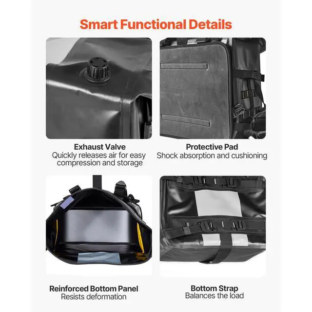 Main Materials: 500D PVC with Mesh Fabric,Capacity: 28 L per Side, 56 L Total,Item Model Number: NMXQ008,Product Weight: 9.3 lbs/4.2 kg,Product Dimensions: 15.0 x 7.9 x 13.8 in/380 x 200 x 350 mm