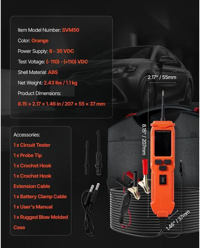 Test Voltage: (- 110) - (+110) VDC,Color: Orange,Item Model Number: SVM50,Shell Material: ABS,Product Dimensions: 8.15 x 2.17 x 1.46 in/207 x 55 x 37 mm,Net Weight: 2.43 lbs/1.10 kg,Power Supply: 8 - 35 DCV