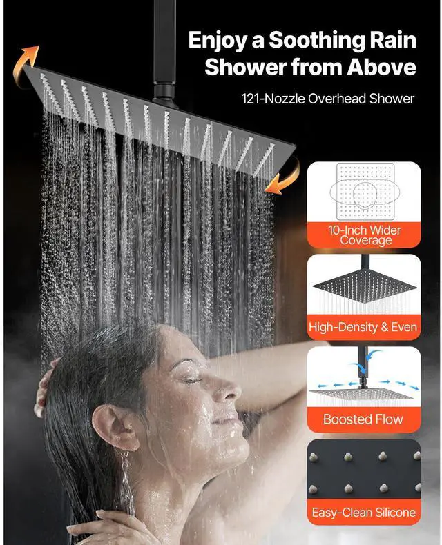VEVOR Shower Faucet Set, 10 Inch Ceiling Mount Rainfall Shower System with 6 Inch Wall Mount Head and 2 in 1 Handheld Spray, Rotatable 3-Function Dual Rain Head Brass Valve and Trim Kit, Matte Black