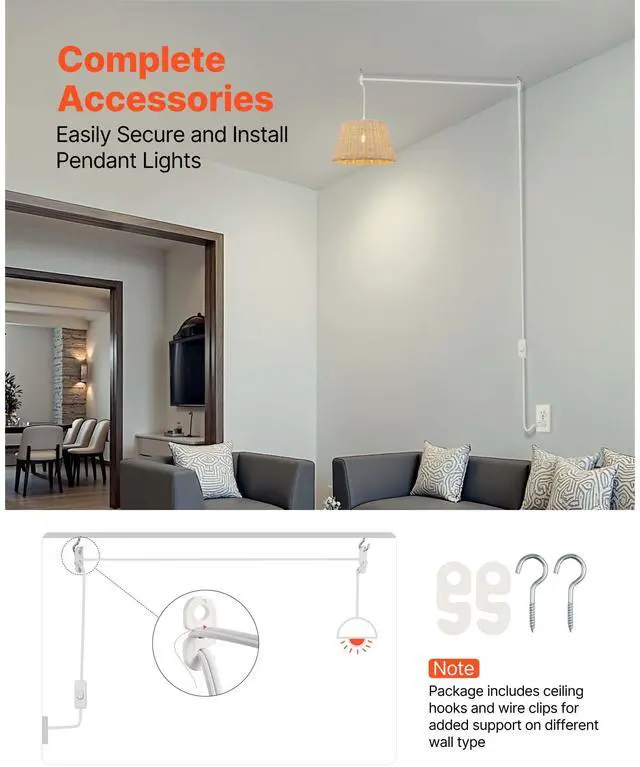 VEVOR Plug in Hanging Light Cord Kit, 16ft Lantern Extension Cords, 2 Pack E26 Light Socket Lamp Cord Replacement, Secure & Sturdy, Easy to Install, Pendant Lamp Kit On/Off Switch & Socket Rings