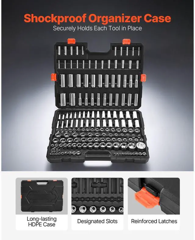 VEVOR Socket Set, 163 Pieces, 3/8 & 1/4 & 1/2 inch Drive Socket Tool Set, SAE and Metric, Deep and Standard, Mechanic Tool Kit with Storage Case, Chrome Plated CR-V Alloy Steel, for Automotive Repair