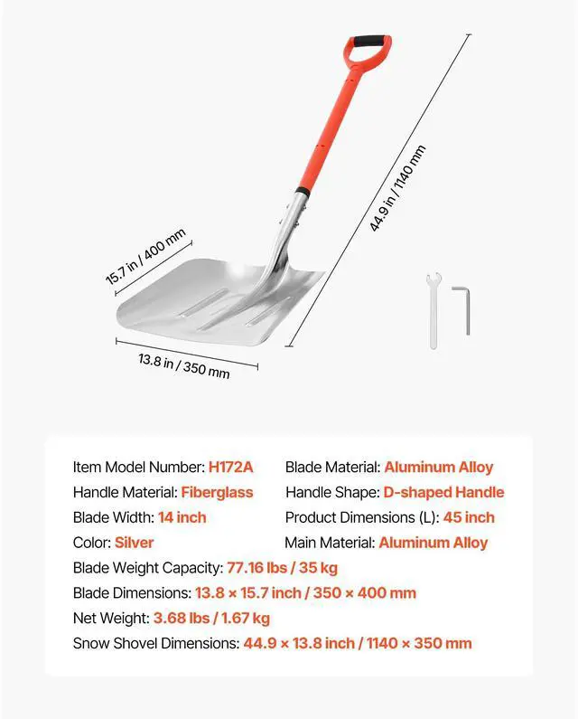Blade Material: Aluminum Alloy,Blade Dimensions: 13.8 x 15.7 in/350 x 400 mm,Color: Silver,Auxiliary Handle: Not Included,Snow Shovel Dimensions: 44.9 x 13.8 in/1140 x 350 mm,Blade Weight Capacity: 77.16 lbs/35 kg,Handle Shape: D-shaped Handle,Item Model Number: H172A,Detachable Design: None,Product Dimensions (L): 45 in,Net Weight: 3.68 lbs/1.67 kg,Handle Material: Fiberglass,Main Material: Aluminum Alloy,Blade Width: 14 in