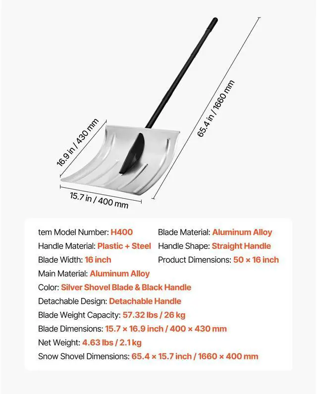 Blade Material: Aluminum Alloy,Blade Dimensions: 15.7 x 16.9 in/400 x 430 mm,Color: Silver Shovel Blade & Black Handle,Auxiliary Handle: Not Included,Product Dimensions: 66 x 16 in,Snow Shovel Dimensions: 65.4 x 15.7 in/1660 x 400 mm,Blade Weight Capacity: 57.32 lbs/26 kg,Handle Shape: Straight Handle,Item Model Number: H400,Detachable Design: Detachable Handle,Net Weight: 4.63 lbs/2.1 kg,Handle Material: Steel,Main Material: Aluminum Alloy,Blade Width: 16 in