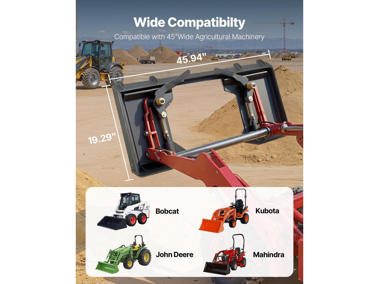 - Universal Compatibility: This skid steer mount plate fits skid steers, tractors, and agricultural machinery with a 45-inch internal width. It is compatible with popular brands including John Deere, Kubota, Bobcat, Mahindra, and more