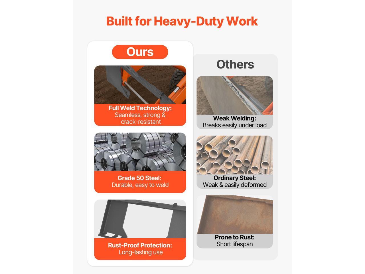 - Heavy-Duty Construction: Built from 50-grade steel with a 1/2-inch thickness, our skid steer attachment plate supports up to 6000 lbs. It offers exceptional wear resistance to handle demanding, heavy-duty tasks