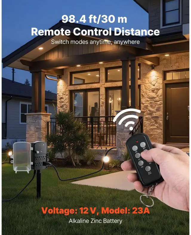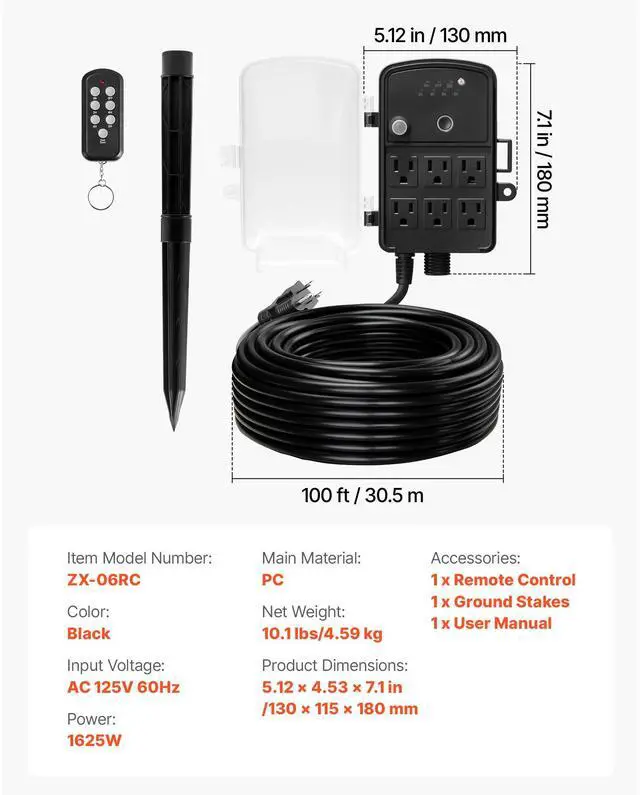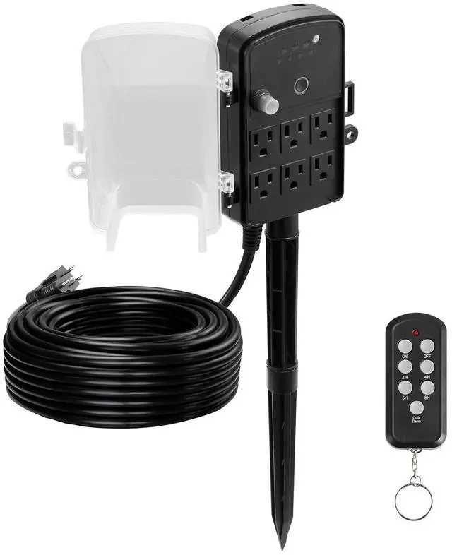 VEVOR Outdoor Power Stake, 100FT Extension Cord, Outdoor Power Strip Weatherproof with Cover, Remote Control Dusk to Dawn Light Timer Waterproof, 6 Outlets, 1625W/13A, for Christmas Lights, Garden
