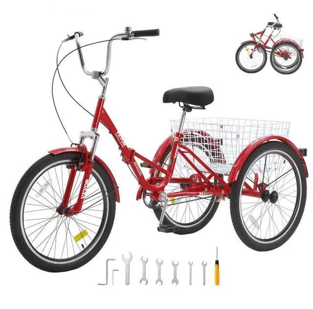 VEVOR Folding Adult Tricycle, 24-Inch Adult Folding Trikes, Carbon Steel 3 Wheel Cruiser Bike with Large Basket & Adjustable Seat, Shopping Picnic Foldable Tricycles for Women, Men, Seniors (Red)
