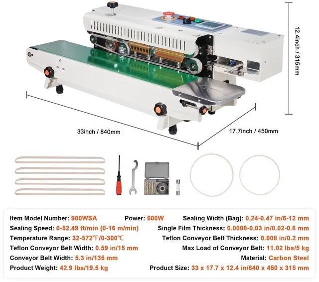 Sealing Speed: 0-52.49 ft/min (0-16 m/min),Max Load of Conveyor Belt: 11.02 lbs/5 kg,Sealing Width (Bag): 0.24-0.47 in/6-12 mm,Material: Carbon Steel,Product Size: 33 x 17.7 x 12.4 in/840 x 450 x 315 mm,Teflon Conveyor Belt Thickness: 0.008 in/0.2 mm,Teflon Conveyor Belt Width: 0.59 in/15 mm,Conveyor Belt Width: 5.3 in/135 mm,Item Model Number: 900WSA,Product Weight: 42.99 lbs/19.5 kg,Temperature Range: 32-572/0-300,Single Film Thickness: 0.0008-0.03 in/0.02-0.8 mm,Power: 600W