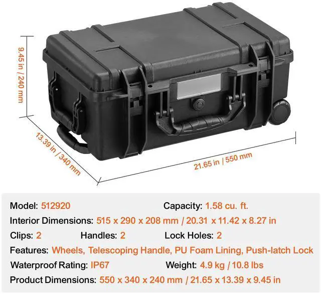 Interior Dimensions: 515 × 290 × 208 mm/20.31 × 11.42 × 8.27 in,Lock Holes: 2,Clips: 2,Waterproof Rating: IP67,Capacity: 1.58 cu. ft.,Model: 512920,Handles: 2,Features: Wheels, Telescoping Handle, PU Foam Lining, Push-latch Lock,Product Dimensions: 550 x 340 x 240 mm /21.65 x 13.39 x 9.45 in,Weight: 4.9 kg/10.8 lbs