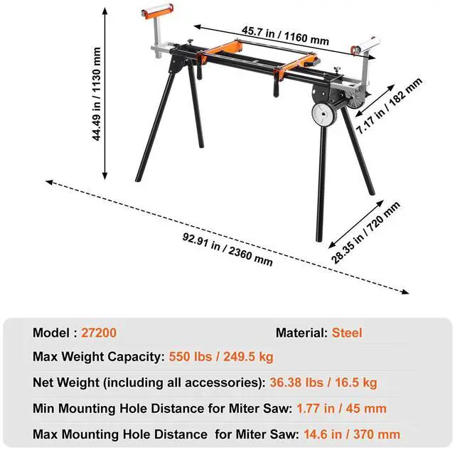Item Model Number: 27200 Max Weight Capacity: 550 lbs / 249.5 kg Material: Steel Net Weight (with all accessories): 36.38 lbs / 16.5 kg Minimum Miter Saw Mounting Hole Distance: 1.2 in / 30 mm Maximum Miter Saw Mounting Hole Distance: 14.6 in / 370 mm