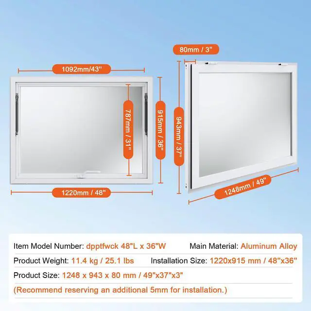 Installation Size: 1220x915 mm / 48x36 inch,Item Model Number: dpptfwck48L*36W,Product Weight: 11.4 kg / 25.1 lbs,Main Material: Aluminum Alloy,Product Size: 1248x943x80 mm / 49x37x3 inch