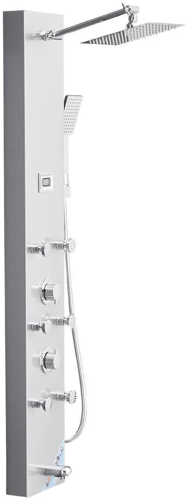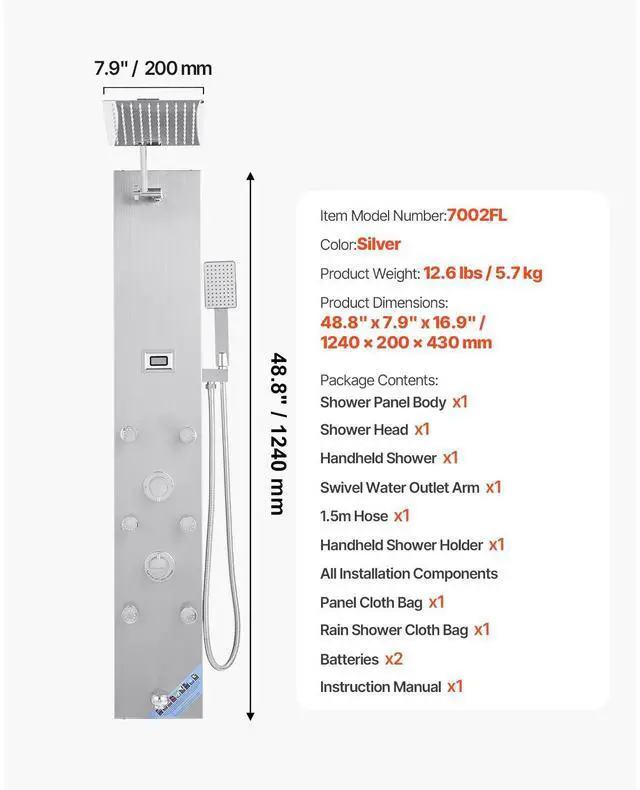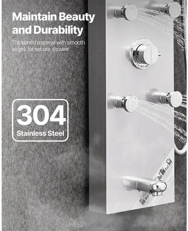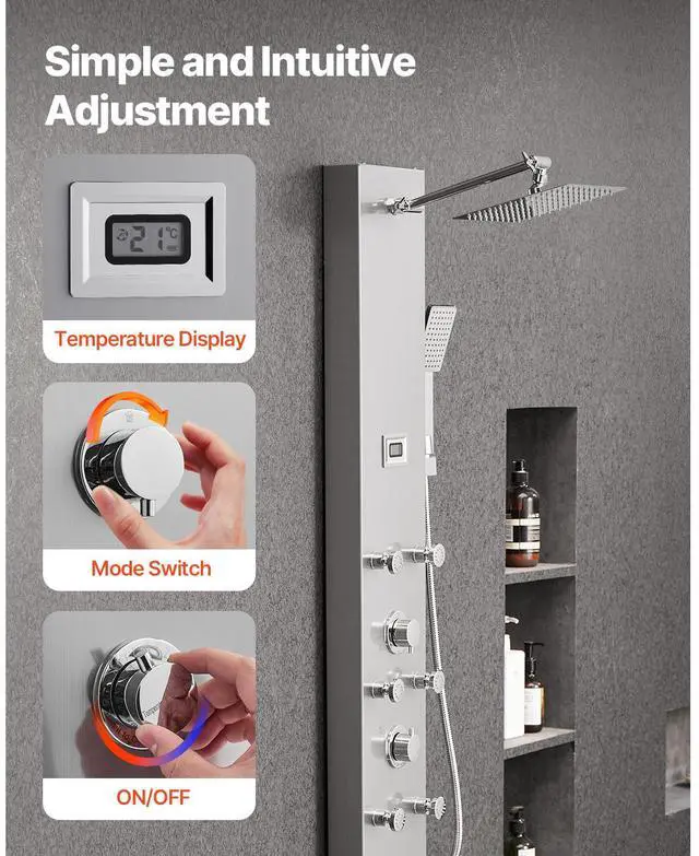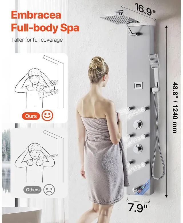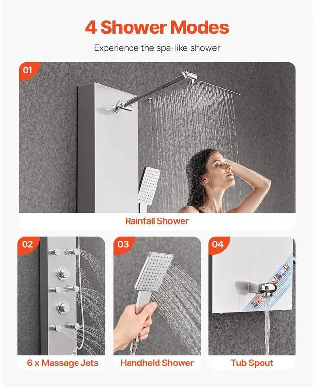 VEVOR Shower Panel Tower System with Rainfall Shower Head, LED, 49 in Brushed Stainless Steel Shower Column, 4-Function Faucet, Wall-Mount Rain Massage System with 6 Body Jets, Handheld, and Tub Spout