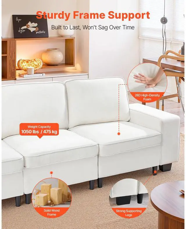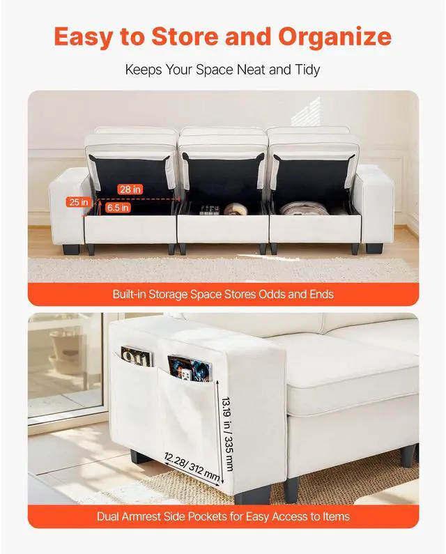 VEVOR 100-Inch Modular 3-Seater Sofa Comfy Couch with Deep Seats & Hidden Storage, Modern Design for Living Room, Apartment, or Office, White