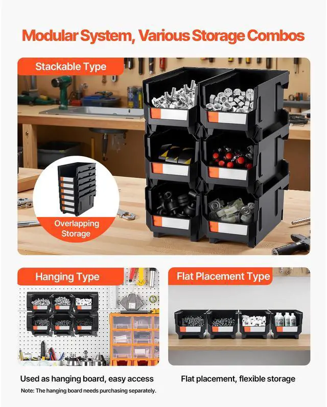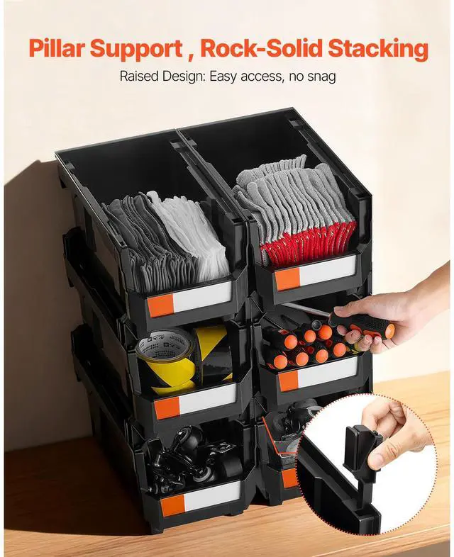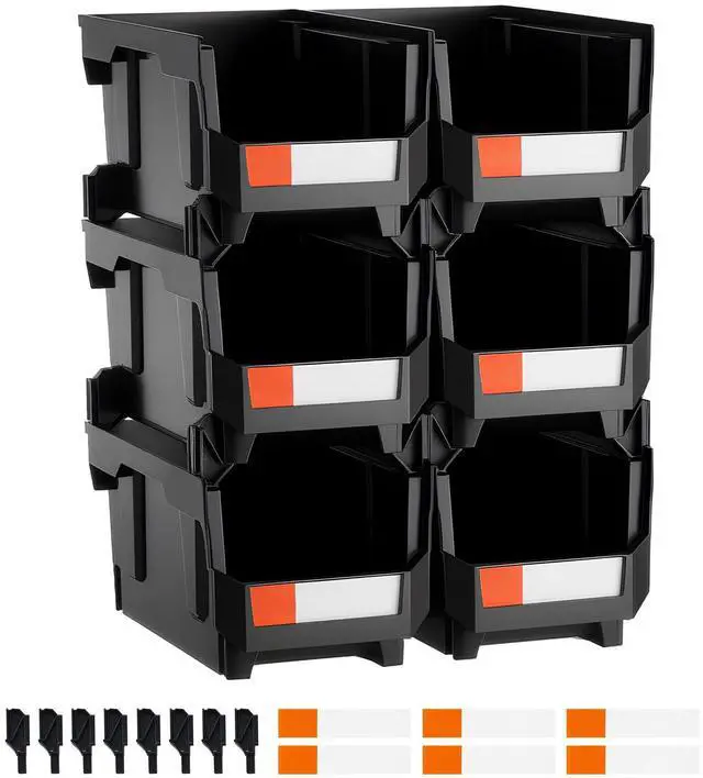 VEVOR Plastic Stackable Storage Bins, 14.8 x 8.5 x 7.1 inch (6 Pack), Plastic Containers for Organizing and Storage Bins for Closet, Garage, Small Parts, Office Supplies and Other Accessories, Black