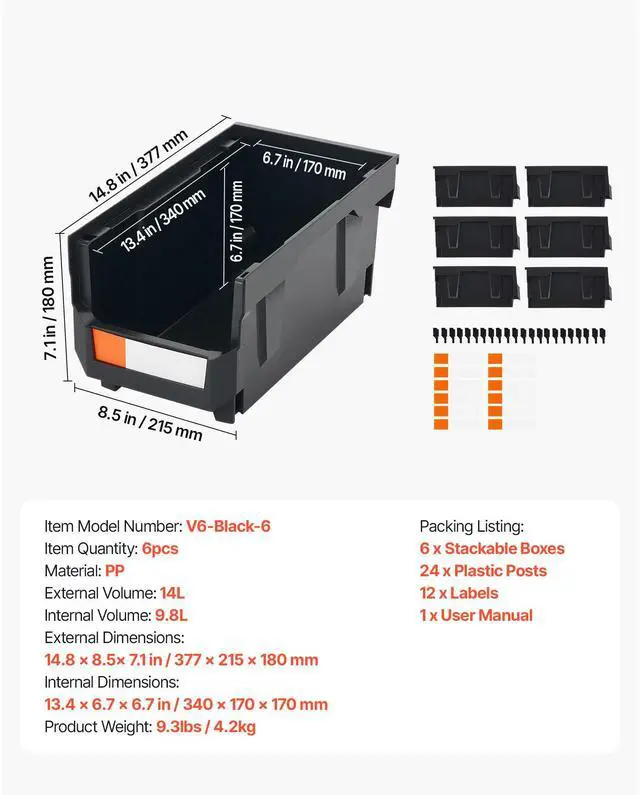 Item Quantity: 6pcs,External Dimensions: 14.8 x 8.5 x 7.1 in / 377 x 215 x 180 mm,External Volume: 14 L; Internal Volume: 9.8 L,Item Model Number: V6-Black-6,Product Weight: 8.6 lbs / 3.9 kg,Material: PP,Internal Dimensions: 13.38 x 6.7 x 6.7 in / 340 x 170 x 170 mm