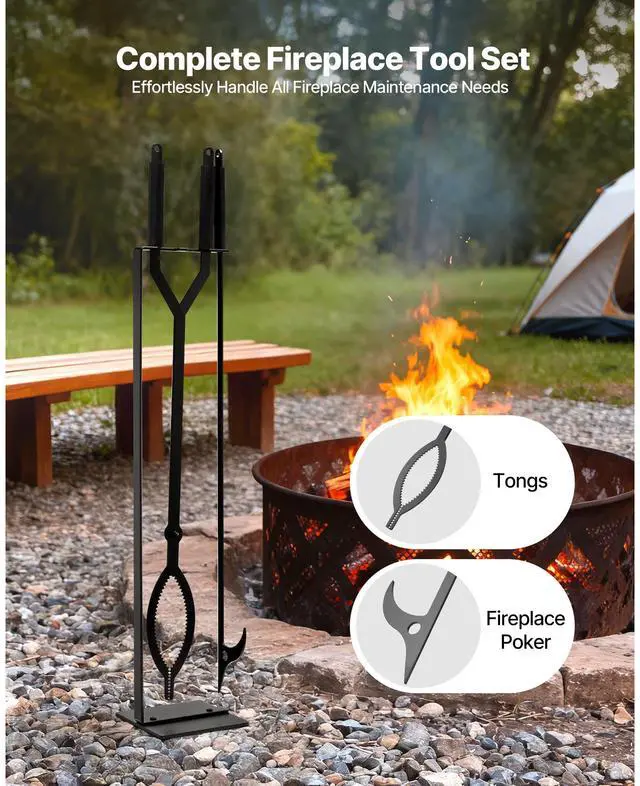 VEVOR Fireplace Tool Set, 3 PCS Fire Tool Set and Holder with Stand, Tongs, Fire Place Poker, Wrought Iron Fireplace Accessories for Campfire Backyard Bonfire Indoor/Outdoor, Black