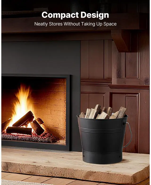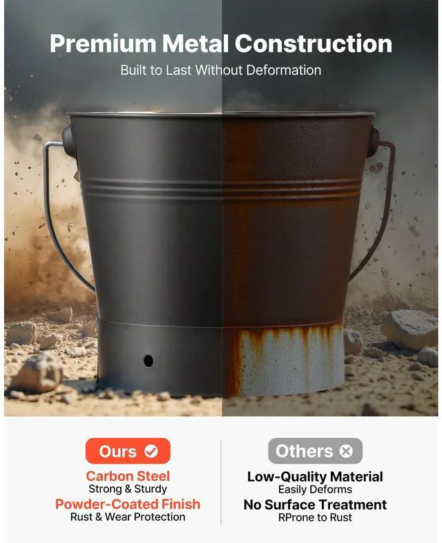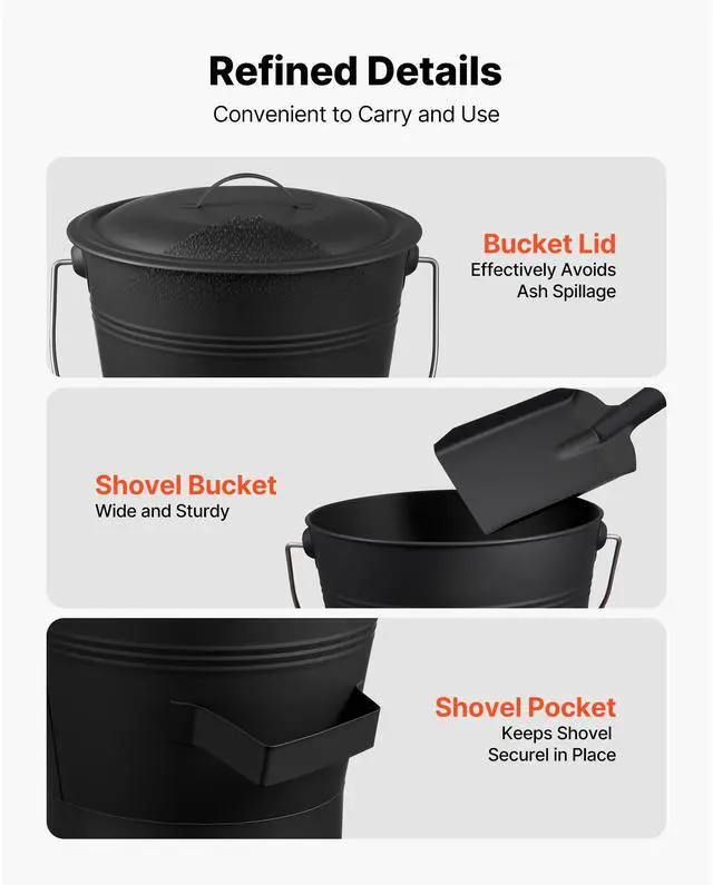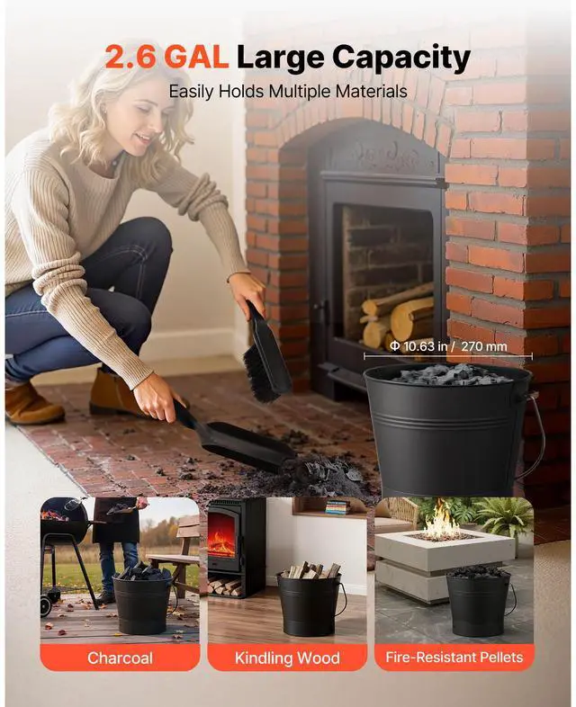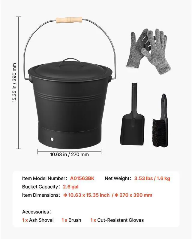 VEVOR Ash Bucket, 4 PCS with Lid, Shovel, Broom and Gloves, Metal Fireplace Charcoal Bucket and Ash Can, 2.6 GAL Large Capacity for Fireplace, Fire Pits, Wood Burning Stoves, Indoor and Outdoor