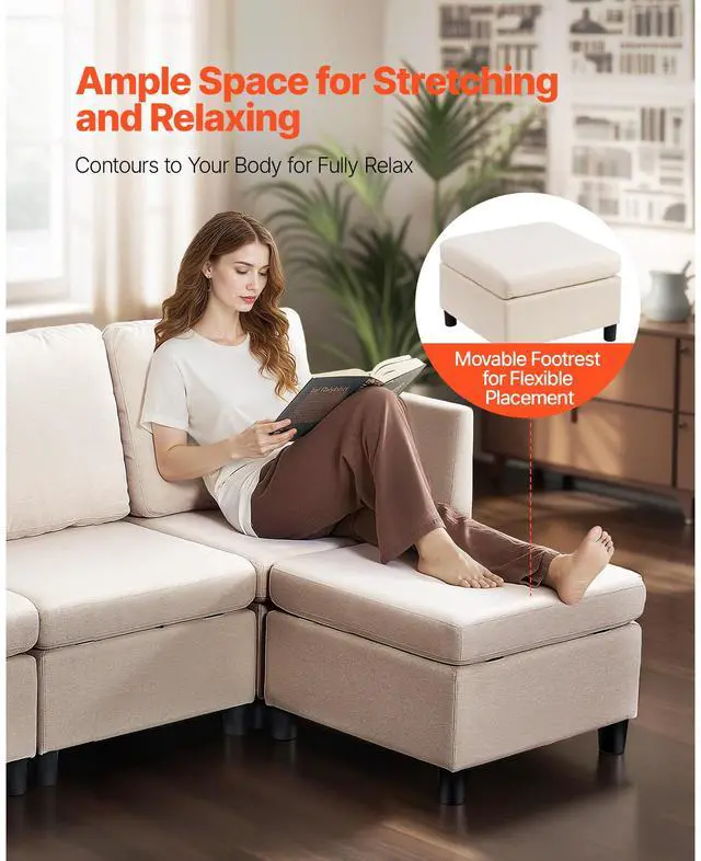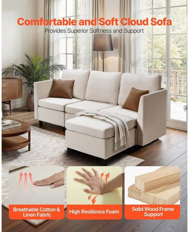 VEVOR Modular Sectional Sofa, 3-Seater Modular Sofa with Hidden Storage, Cloud Sectional Couch with Ottoman & High Rebound Sponge, Solid Wood Frame Upholstered Couch for Living Room, Bedroom, Beige