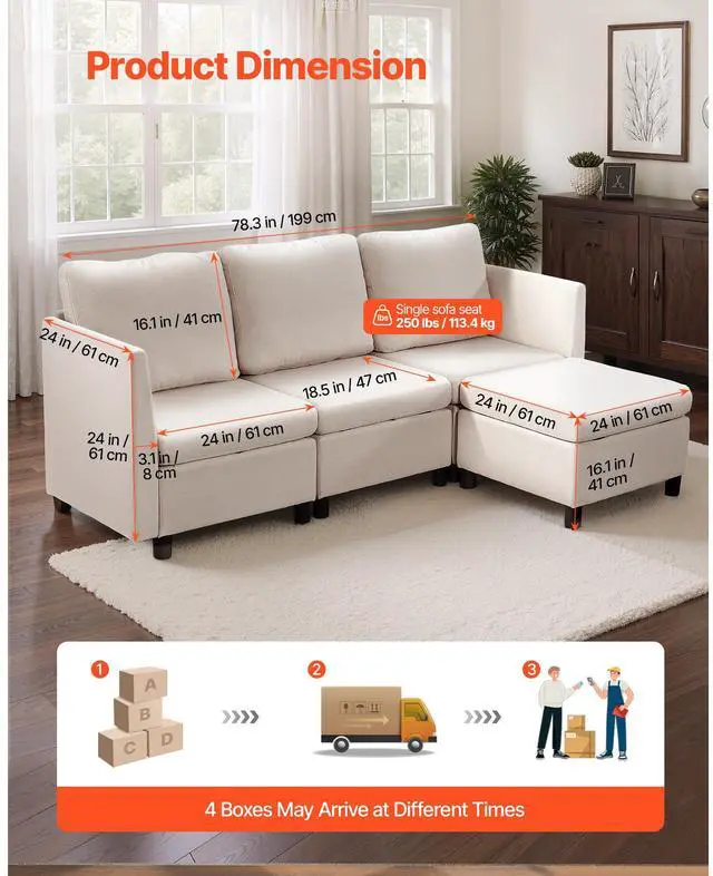 Box B (Seat Cushion + Armrest + Back Cushion): 39.9 lbs / 18.1 kg,Box C (Seat Cushion + Armrest + Back Cushion): 39.9 lbs / 18.1 kg,Single Seat Weight Capacity: 250 lbs / 113.4 kg,Box A (Seat Cushion + Armrest + Back Cushion): 39.9 lbs / 18.1 kg,Color: Off-white,Armrest Dimensions: 24 x 24 x 3.1 in / 61 x 61 x 8 cm,Single Seat Width: 24 in / 61 cm,Product Dimensions: 78.3 x 27.1 x 26.7 in / 199 x 69 x 68 cm,Seat Depth (without Backrest): 24 in / 61 cm,Ottoman: 24 x 24 x 16.1 in / 61 x 61 x 41 cm,Cushion Thickness: 4.3 in / 11 cm,Sofa Leg Height: 3.1 in / 8 cm,Storage Space (WxDxH): 19.3 x 19.3 x 7.1 in / 49 x 49 x 18 cm,Box D (Seat Cushion + 2 Armrests): 45.2 lbs / 20.5 kg,Main Materials: Cotton-Linen Fabric + Solid Wood,Item Model Number: SS001-3,Seat Height: 16.1 in / 41 cm