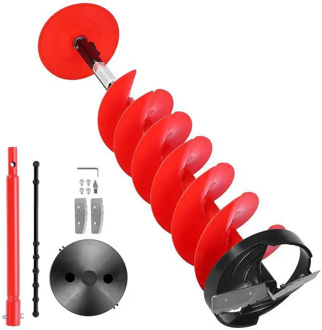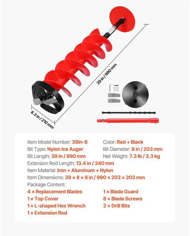 Blade Material: Iron,Item Dimensions (L×W×H): 37 × 8.3 × 8.3 in / 940 × 210 × 210 mm,Power Type: None,Spiral Blades: Nylon, Ø175 × 88 mm, red, 6 pcs,Color: Red + Black,Drill Diameter: 8 in / 203 mm,Item Type: Accessory,Drill Head: Cast aluminum, Ø195 mm, black,Drill Type: Nylon Ice Auger ×1,Drill Length: 39 in / 990 mm,Item Model Number: 39in-8,Number of Drill Bits: 1,Net Weight: 3.3 kg,Main Material: Iron + Aluminum + Nylon,Main Tube: Hollow aluminum tube, 840 × 30 × 30 mm, black, 2.6 mm wall thickness