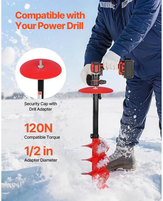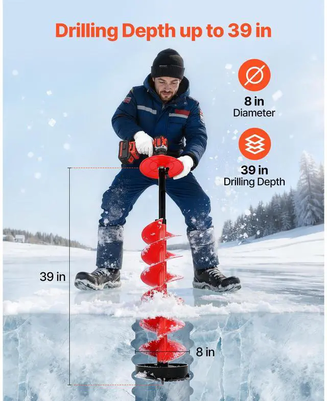 VEVOR Ice Auger Drill Bit, 8in Diameter 39in Length, Cordless Nylon Ice Fishing Augers With Extra 13.4in Extension Rod, Drill Adapter, Top Plate and Blade Guard
