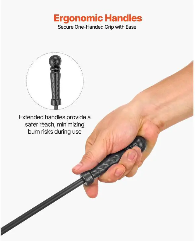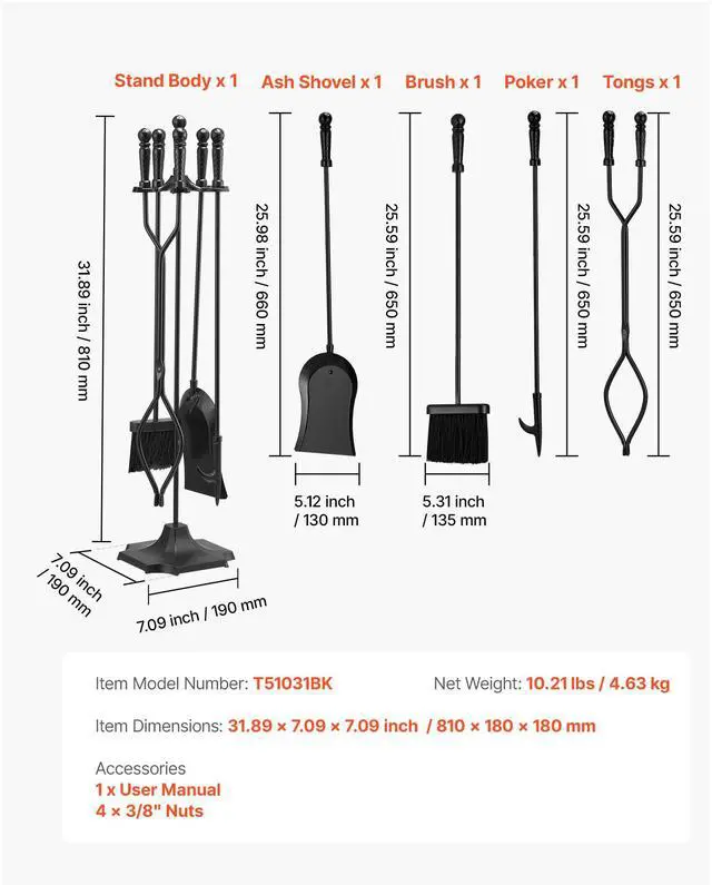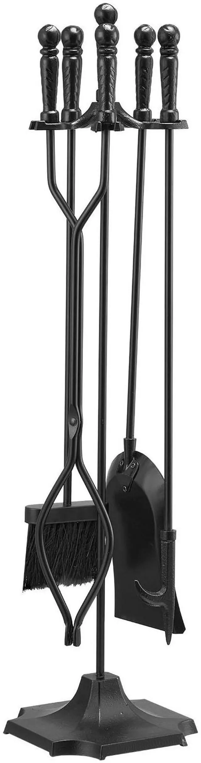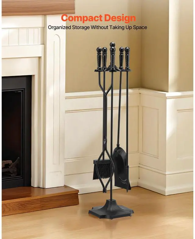 VEVOR Fireplace Tool Set, 5 PCS Fire Tool Set and Holder with Five-Prong Stand, Tongs, Ash Shovel, Brush, Fire Place Poker, Wrought Iron Fireplace Accessories for Campfire Indoor/Outdoor, Black