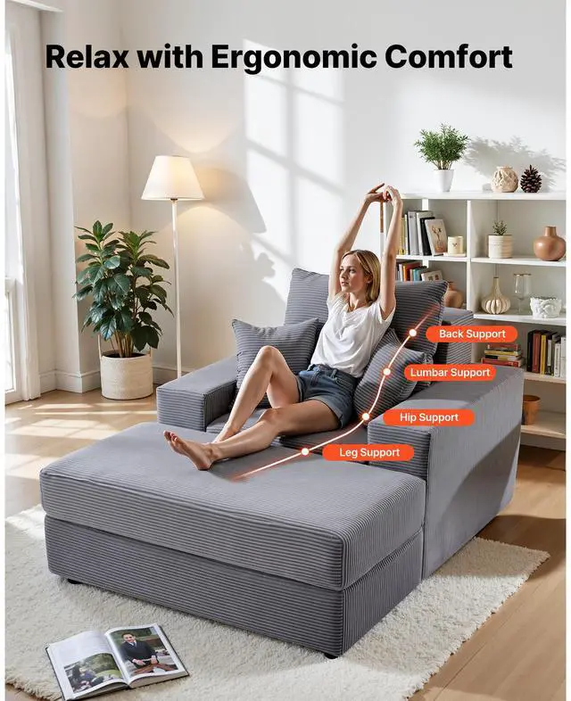 VEVOR Chaise Lounge Chair, 44 in Boneless Modular Chaise Lounge Indoor, Oversized Corduroy Reading Chair with Throw Pillows & Armrests, Deep Seat Sofa Couch Sleeper for Living Room, Bedroom, Grey