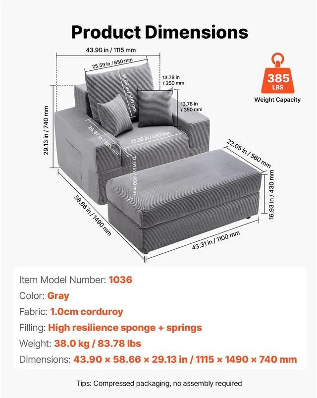 Color: Gray,Model: 1036,Dimensions: 43.90×58.66×29.13 in / 1115×1490×740 mm,Filling: High resilience sponge + springs,Fabric: 1.0cm corduroy,Weight: 38.0 kg / 83.78 lbs