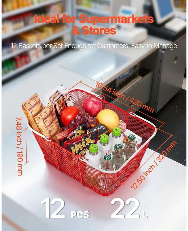 VEVOR Shopping Baskets, 12 PCS, 22L Stackable Metal Grocery Baskets with Handles, Dense Mesh Structure, Holds up to 44 lbs, Portable for Grocery, Retail, Stores, Supermarket, Bookstore, Home Use, Red