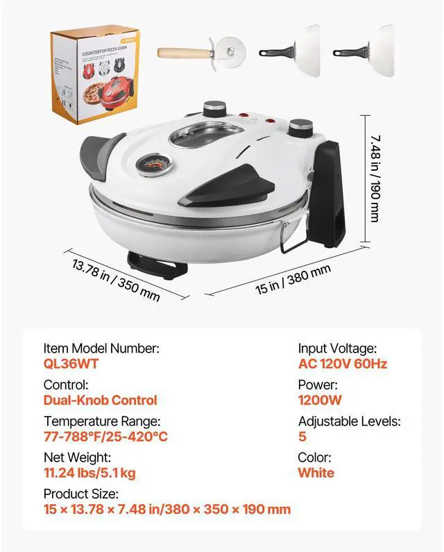 Adjustable Levels: 5,Control: Dual-Knob Control,Color: White,Item Model Number: QL36WT,Temperature Range: 77-788°F/25-420°C,Input Voltage: AC 120V 60Hz,Net Weight: 11.24 lbs/5.1 kg,Power: 1200W,Product Size: 15 x 13.78 x 7.48 in/380 x 350 x 190 mm