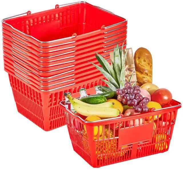 VEVOR Shopping Baskets, 12 PCS, 21L Stackable PE Plastic Grocery Baskets with Metal Handles, Dense Mesh Structure, Holds up to 20 lbs, Portable for Grocery, Retail, Stores, Supermarket, Home Use, Red