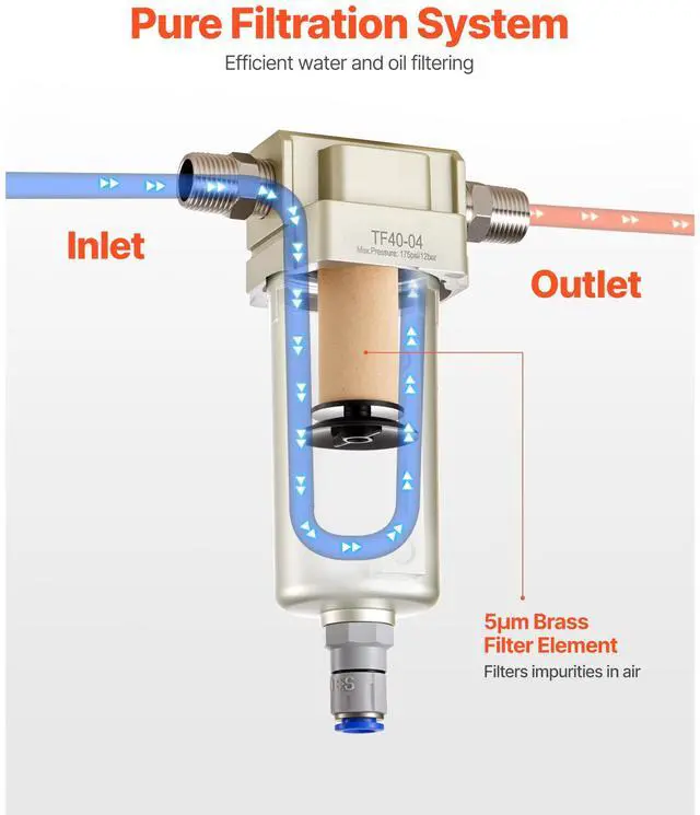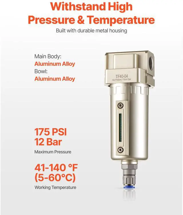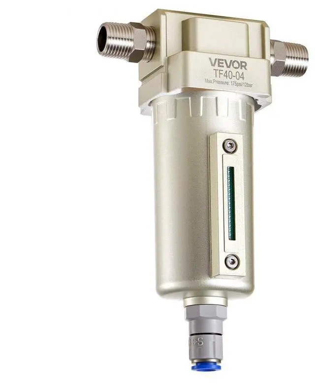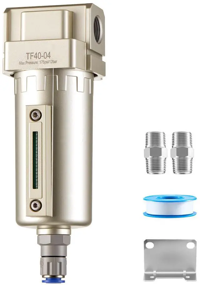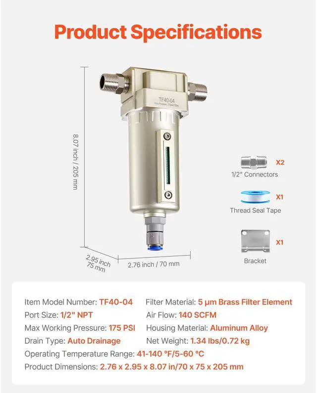 Air Flow: 140 SCFM,Housing Material: Aluminum Alloy,Port Size: 1/2" NPT,Operating Temperature Range: 41-140 /5-60 ,Item Model Number: TF40-04,Filter Material: 5 m Brass Filter Element,Drain Type: Auto Drainage,Max Working Pressure: 175 PSI,Product Dimensions: 2.76 x 2.95 x 8.07 in/70 x 75 x 205 mm,Net Weight: 1.34 lbs/0.72 kg