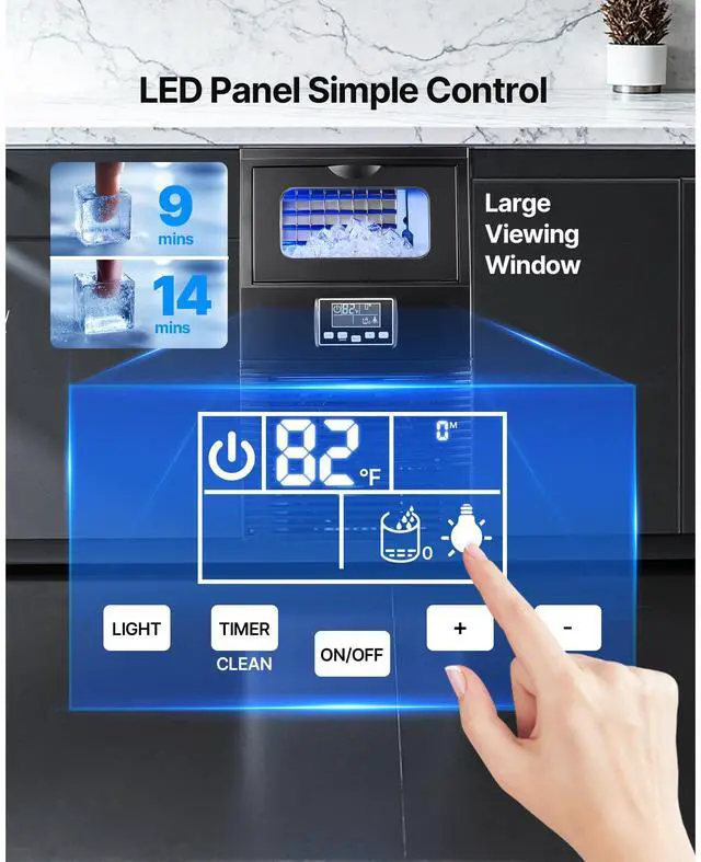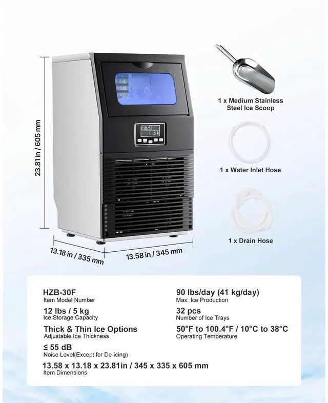 Noise Level: 55 dB,Number of Ice Trays: 32 pcs,Operating Temperature: 50°F to 100.4°F / 10°C to 38°C,Item Model Number: HZB-30F,Product Weight: 40.79 lbs / 18.50 kg,Max. Ice Production: 90 lbs/day (41 kg/day),Adjustable Ice Thickness: Thick & Thin Ice Options,Ice Storage Capacity: 12 lbs / 5 kg,Product Dimensions: 13.58 x 13.35 x 23.70 in / 345 x 339 x 602 mm